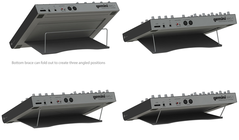 The Gemini MAS-1 is a specialised DJ controller that allows users to maintain the feel of traditional DJing when using Ableton Live. Featuring a familiar 4 channel DJ mixer layout with additional control elements for devices and effects contained in Ableton Live. It also offers an expanded BPM section to allow for smoother mixing into external sources. The onboard 4 channel audio interface is loud and warm, and the hardware interface itself is designed to work well in dark environments, with high contrast highlights and backlit buttons. The MAS-1 has a built-in stand, allowing it to be tilted towards the user in multiple positions to create the perfect viewing angle.