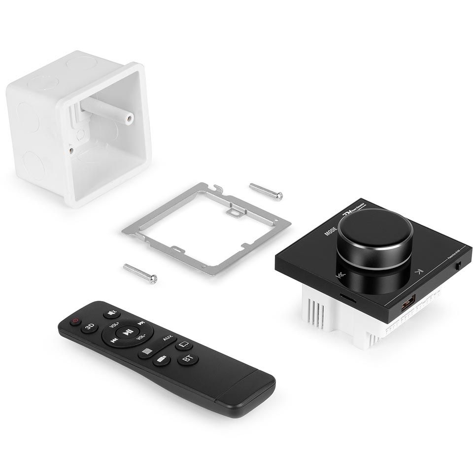 The Power Dynamics Powerline B100B is a sleek in-wall audio amplifier that turns any room into a clean, high-quality sound zone. It delivers strong, efficient power from a 4 × 25 W Class-D amplifier while keeping cables hidden behind a flush-mounted gloss-black panel with an LCD display, touch controls, and a rotary volume knob. With built-in Bluetooth 5.0, USB and microSD MP3 playback, FM radio, and AUX input, it easily handles both wireless streaming and wired sources. Rear speaker terminals support four speakers, and line-level input and output allow simple system expansion. Supplied with a back box and remote, the B100B offers neat installation and easy control for homes, offices, and commercial spaces.