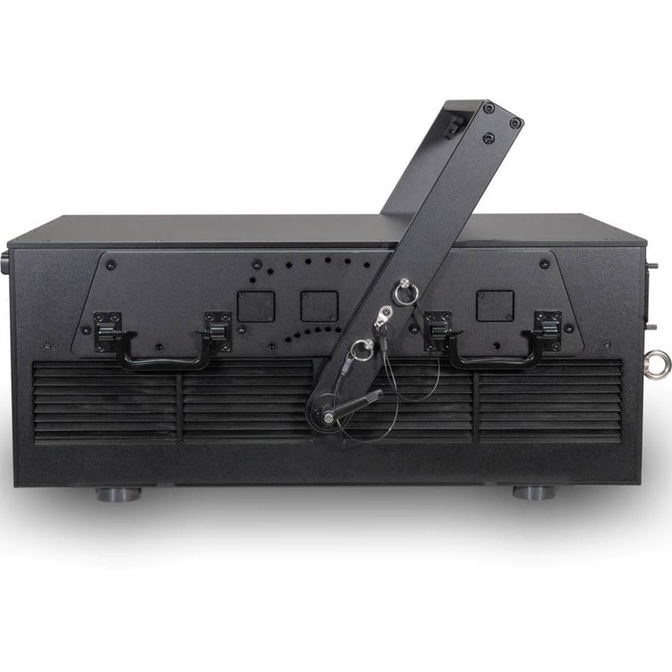 The Laserworld PL-70.000RGB FB4 IP65 is a powerhouse laser projector delivering an extraordinary 70 W of RGB output for large-scale shows, stadiums and festivals. Its advanced diode arrays (29 W each for red, green and blue) ensure brilliant full-colour mixing, while the 10 mm / 1.1 mrad beam and 30 kpps scanners deliver crisp graphics, smooth text and sharp aerial effects even across long throw distances. Control is highly versatile with the integrated Pangolin FB4 interface, offering DMX, ArtNet, ILDA, LAN and stand-alone playback via SD card. Compatible with QuickShow and BEYOND, it adapts to both automated and live show workflows. On-board safety settings remain active across all modes, and multiple units can be daisy-chained for simplified multi-projector installations. Designed for the toughest environments, its IP65-rated housing, external cooling fins and sealed optics chamber ensure low maintenance and weather resistance. A 360° mounting bracket and rugged waterproof flightcase make it fully tour-ready.